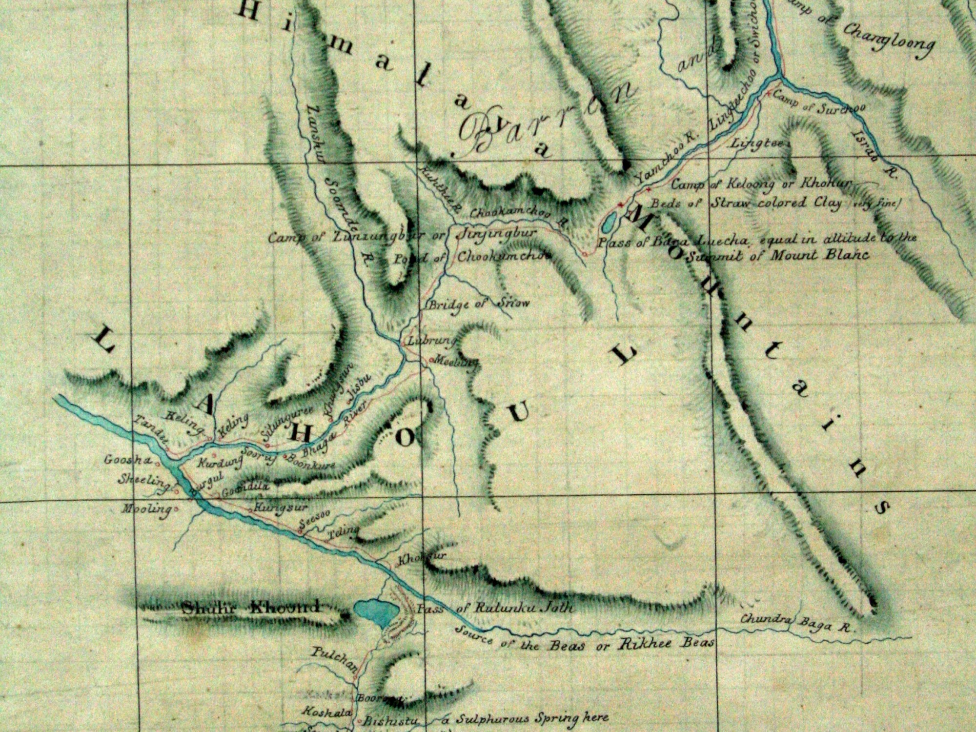 Following the first Anglo-Sikh war, Cunningham made further exploratory visits to the ‘Tibetan frontier of Ladak’ as part of a border commission deputed ‘to ascertain the ancient boundaries between the two countries, and to lay down the boundary between the British territories and those of Maharaja Gulab Sing’ (Cunningham, Alexander, 1854, P13). Given their task Cunningham’s second account of his crossing of the Rohtang Range is predictably filled with factual data:
